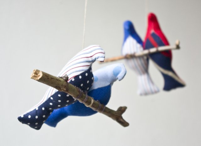 Siedem ptaszków siedzących na gałązkach lekko porusza się przy najmniejszym ruchu powietrza. Ptaszki zostały uszyte z tkanin w kolorze czerwonym, niebieskim i białym. Zawieszka pasuje zarówno do pokoju małej dziewczynki jak i małego chłopca, ale także sprawdzi się w innych pomieszczeniach domu. Rozmiary dekoracji: dł: 46cm, szer: 26cm; wysokość pojedynczego ptaszka to około 12cm.