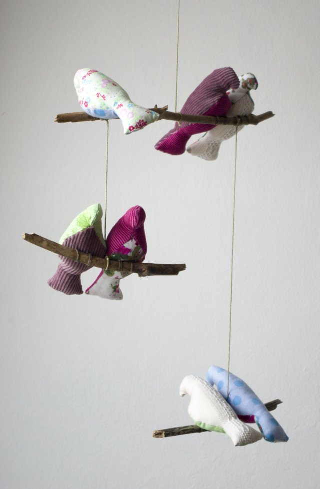 Siedem ptaszków siedzących na gałązkach lekko porusza się przy najmniejszym ruchu powietrza. Ptaszki zostały uszyte z tkanin w kolorze różowym, zielonym, niebieskim, liliowym i beżowym. Zawieszka pasuje do pokoju małej dziewczynki, ale także sprawdzi się w innych pomieszczeniach domu. Rozmiary dekoracji: dł: 37cm, szer: 26cm; wysokość pojedynczego ptaszka to około 12cm.