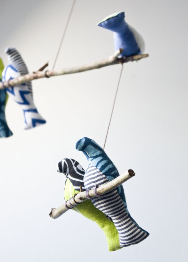 Siedem ptaszków siedzących na gałązkach lekko porusza się przy najmniejszym ruchu powietrza. Ptaszki zostały uszyte z tkanin w kolorze zielonym, niebieskim, granatowym, białym i czarnym. Zawieszka pasuje zarówno do pokoju małej dziewczynki jak i małego chłopca, ale także sprawdzi się w innych pomieszczeniach domu. Rozmiary dekoracji: dł: 42cm, szer: 28cm; wysokość pojedynczego ptaszka to około 12cm.