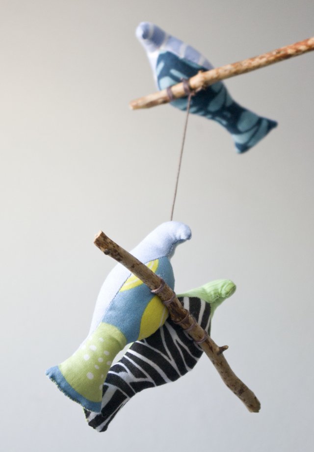 Siedem ptaszków siedzących na gałązkach lekko porusza się przy najmniejszym ruchu powietrza. Ptaszki zostały uszyte z tkanin w kolorze zielonym, niebieskim, granatowym, białym i czarnym. Zawieszka pasuje zarówno do pokoju małej dziewczynki jak i małego chłopca, ale także sprawdzi się w innych pomieszczeniach domu. Rozmiary dekoracji: dł: 43cm, szer: 26cm; wysokość pojedynczego ptaszka to około 12cm.
