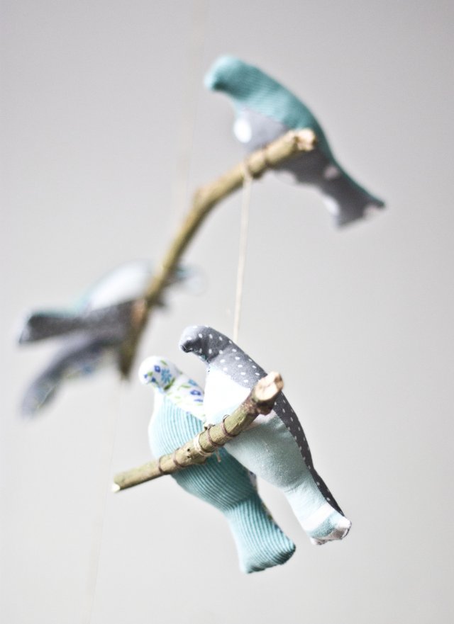 Siedem ptaszków siedzących na gałązkach lekko porusza się przy najmniejszym ruchu powietrza. Ptaszki zostały uszyte z tkanin w kolorze seledynowym, białym, szarym błękitnym. Zawieszka pasuje zarówno do pokoju małej dziewczynki jak i małego chłopca, ale także sprawdzi się w innych pomieszczeniach domu. Rozmiary dekoracji: dł: 39cm, szer: 24cm; wysokość pojedynczego ptaszka to około 12cm.
