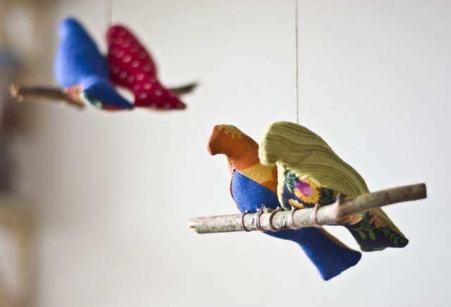 Siedem ptaszków siedzących na gałązkach lekko porusza się przy najmniejszym ruchu powietrza. Ptaszki zostały uszyte z tkanin w kolorze zielonym, pomarańczowym, czerwonym, niebieskim. Zawieszka pasuje zarówno do pokoju małej dziewczynki jak i małego chłopca, ale także sprawdzi się w innych pomieszczeniach domu. Rozmiary dekoracji: dł: 34cm, szer: 25cm; wysokość pojedynczego ptaszka to około 12cm.