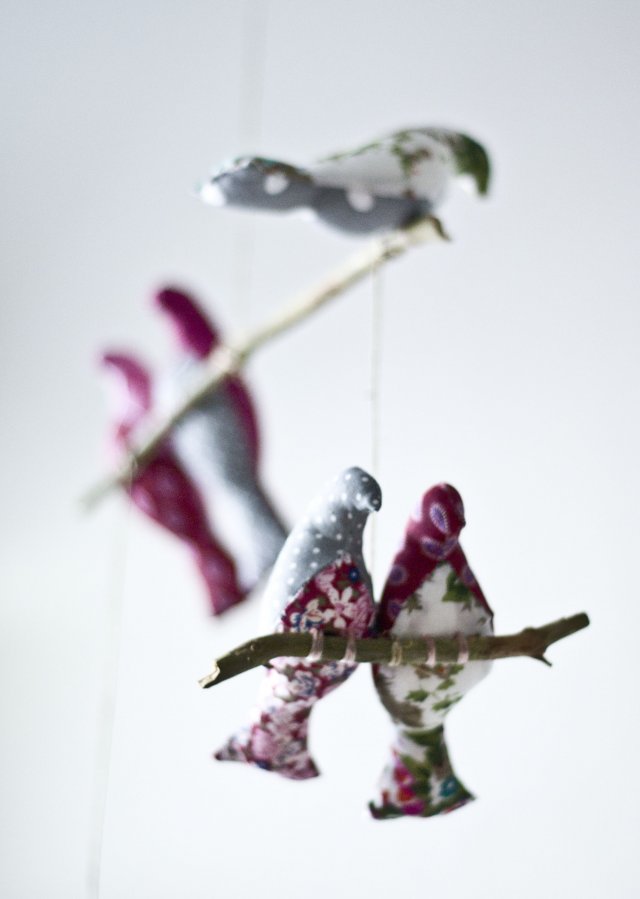 Siedem ptaszków siedzących na gałązkach lekko porusza się przy najmniejszym ruchu powietrza. Ptaszki zostały uszyte z tkanin w kolorze szarym, różowym, wiśniowym i białym. Zawieszka pasuje do pokoju małej dziewczynki, ale także sprawdzi się w innych pomieszczeniach domu. Rozmiary dekoracji: dł: 36cm, szer: 23cm; wysokość pojedynczego ptaszka to około 12cm.
