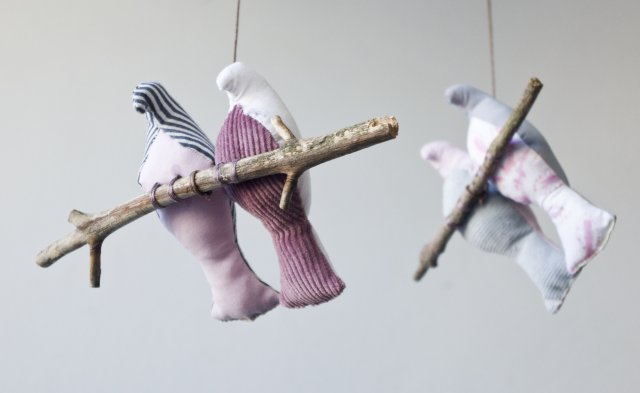 Siedem ptaszków siedzących na gałązkach lekko porusza się przy najmniejszym ruchu powietrza. Ptaszki zostały uszyte z tkanin w kolorze różowym, szarym, liliowym i białym. Zawieszka pasuje do pokoju małej dziewczynki, ale także sprawdzi się w innych pomieszczeniach domu. Rozmiary dekoracji: dł: 36cm, szer: 29cm; wysokość pojedynczego ptaszka to około 12cm.
