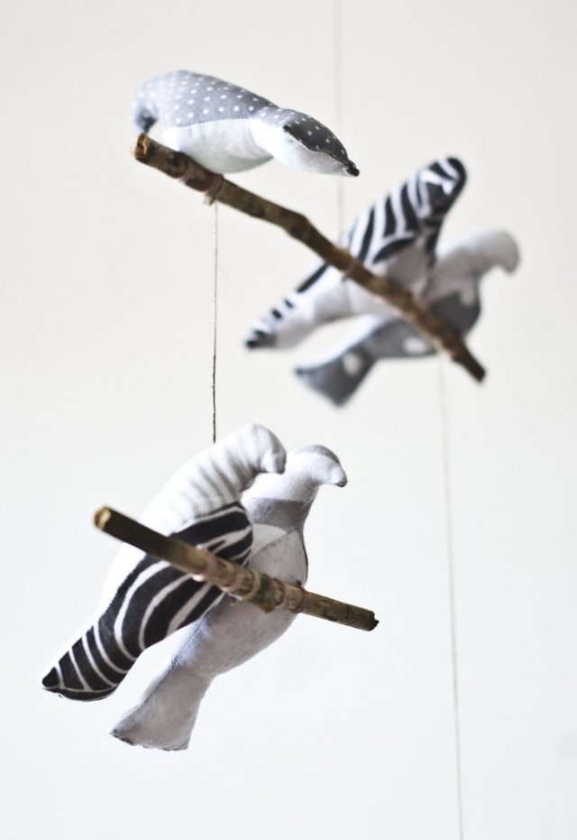 Siedem ptaszków siedzących na gałązkach lekko porusza się przy najmniejszym ruchu powietrza. Ptaszki zostały uszyte z tkanin w kolorze białym,szarym, czarnym i seledynowym. Zawieszka pasuje zarówno do pokoju małej dziewczynki jak i małego chłopca, ale także sprawdzi się w innych pomieszczeniach domu. Rozmiary dekoracji: dł: 45cm, szer: 22cm; wysokość pojedynczego ptaszka to około 12cm.