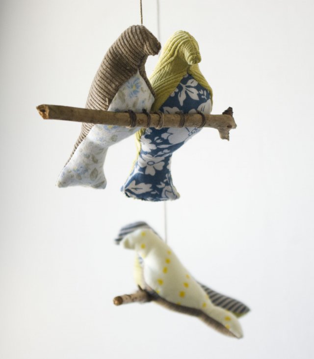 Siedem ptaszków siedzących na gałązkach lekko porusza się przy najmniejszym ruchu powietrza. Ptaszki zostały uszyte z tkanin w kolorze żółtym, zielonym, biebieskim, granatowym i brązowym. Zawieszka pasuje zarówno do pokoju małej dziewczynki jak i małego chłopca, ale także sprawdzi się w innych pomieszczeniach domu. Rozmiary dekoracji: dł: 40cm, szer: 26cm; wysokość pojedynczego ptaszka to około 12cm.