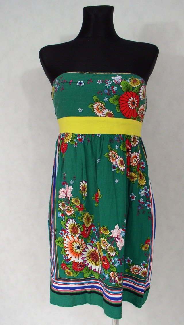 Sukienka w ludowym stylu w bardzo żywych kolorach,firmy twentyone.Rozmiar M.Materiał rayon.Góra odcięta,przód z wstawionym żółtym pasem+dwa paski do wiązania,tył ściągany gumkami.Staniczek podszyty zielonym materiałem.Stan bardzo dobry-.Długość mierzona z boku 72 cm.góra na płasko 72 cm.