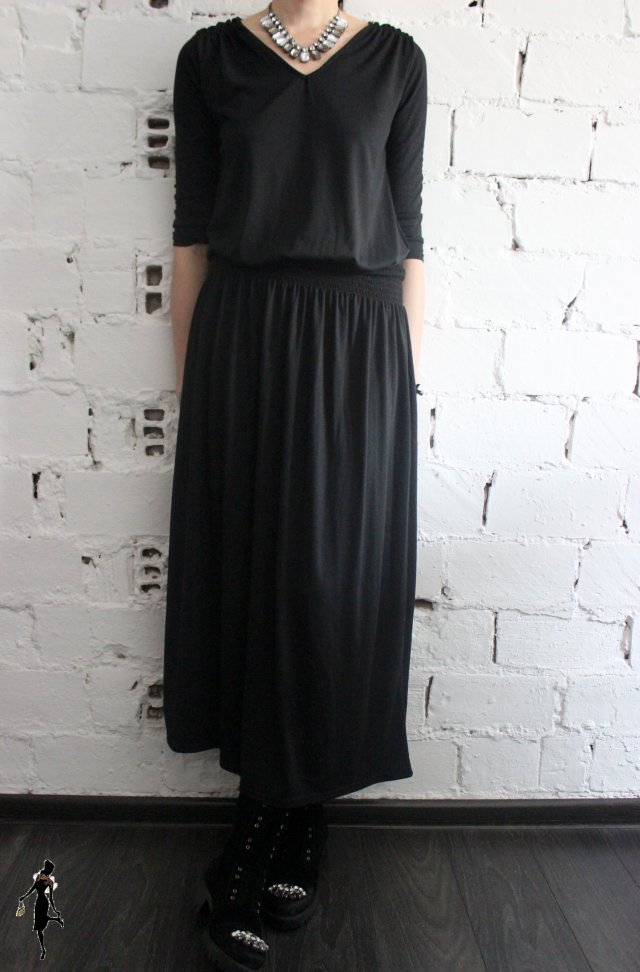 Sukienka czarna, marszczona w pasie. Firma Twentyten. Rozmiar z metki 38/M. Wymiary: obwód biustu-47cmx2 (mierzony od pachy do pachy), obwód pasa-50cmx2 (regulowany gumką), obwód bioder-74cmx2, długość rękawa-44cm, długość sukienki-145cm. Skład materiału: 77% poliester, 19% wiskoza, 4% elastan.