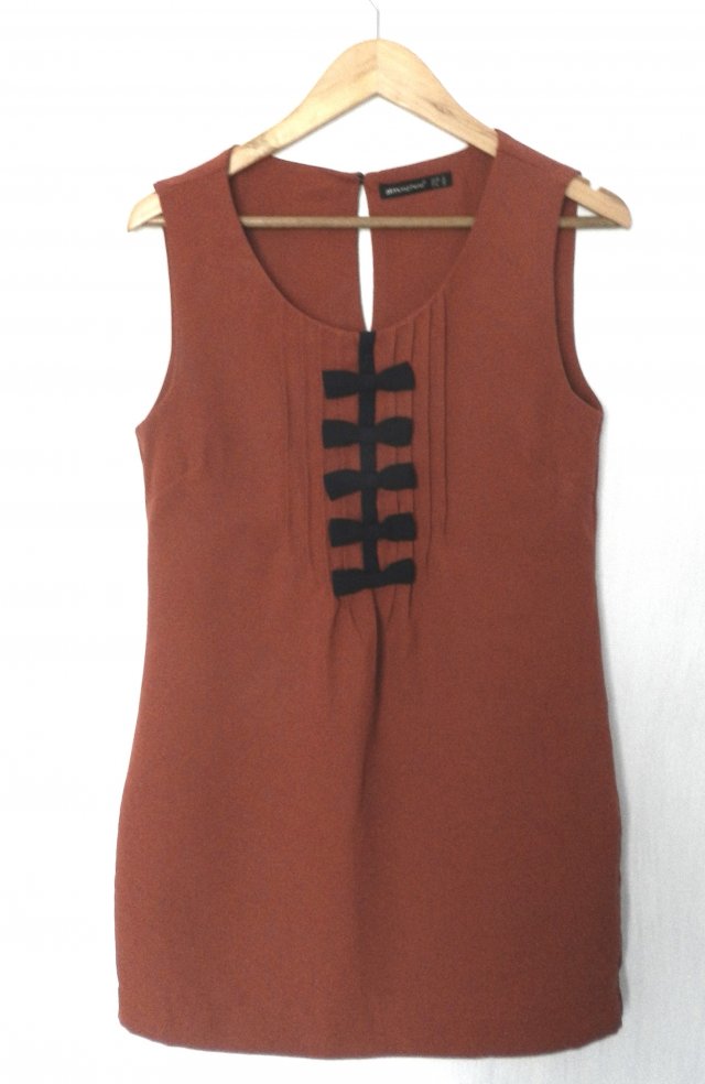 Sukienka w odcieniu rdzawego jesiennego brązu z motywem kokardek ozdobnych na dekolcie w kolorze ciemnego granatu