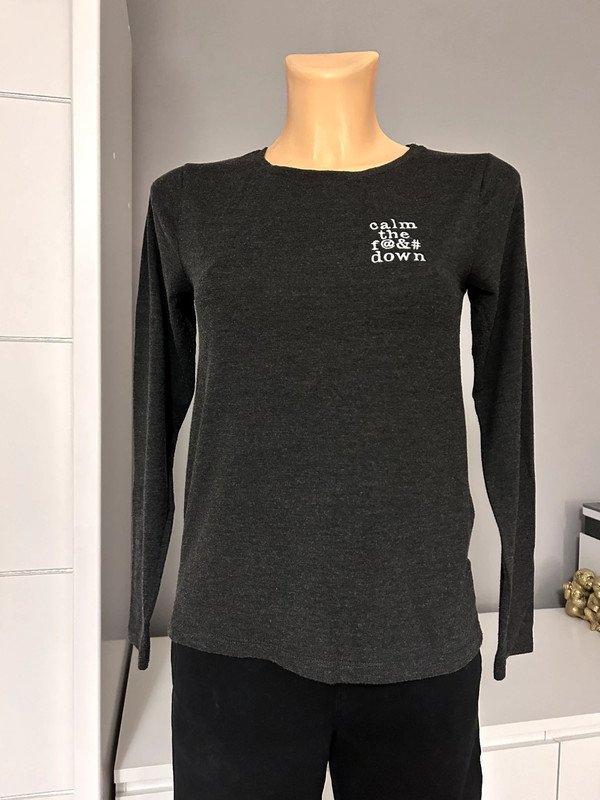 Szara bluzka marki Twintip, rozmiar z metki to XS 34. Posiada napis "calm the fuck down". Będzie dobra również na rozmiar S 36.