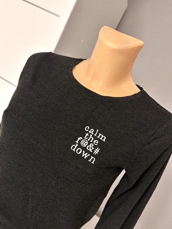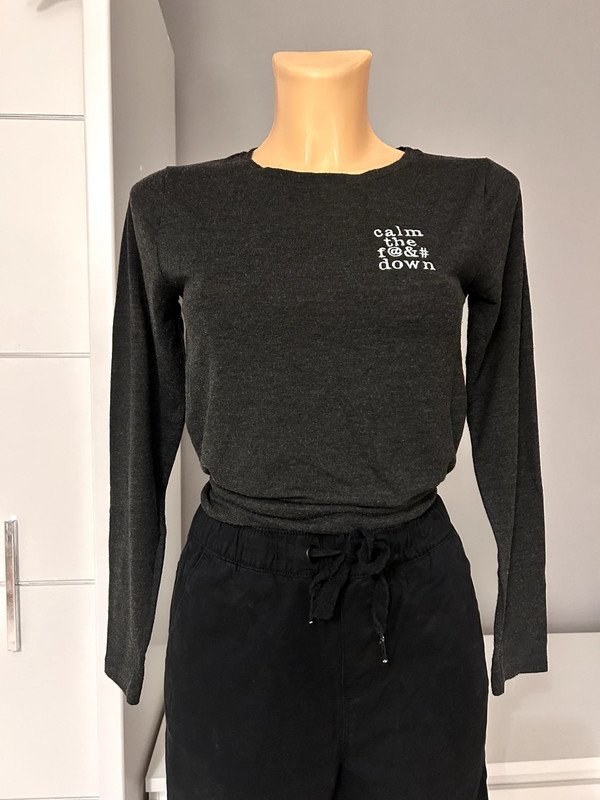 Szara bluzka marki Twintip, rozmiar z metki to XS 34. Posiada napis "calm the fuck down". Będzie dobra również na rozmiar S 36.