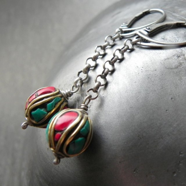 Kolczyki wykonane zostały ze srebra próby 925, oksydowanego i przetartego, oraz tybetańskich korali z mosiądzu (11 mm) zdobionych koralem i turkusem .Długość całkowita kolczyków wynosi 5,5 cm.
