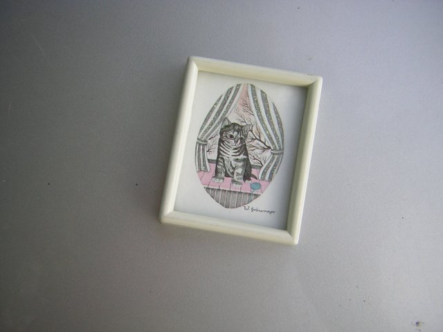 Miniaturowy obrazek. Absolutnie uroczy. Kopia, nie oryginał. Podpis na obrazku -W.Grőnemeyer. Jak medalion w ramce urocza komina niby w okienku. ..Kolory stonowane, zasłonki lekko brokatowe. Ciepło biała plasticzana ramka, szkło. Dekoracja w miniaturze i uroczy drobiazg na prezent.
