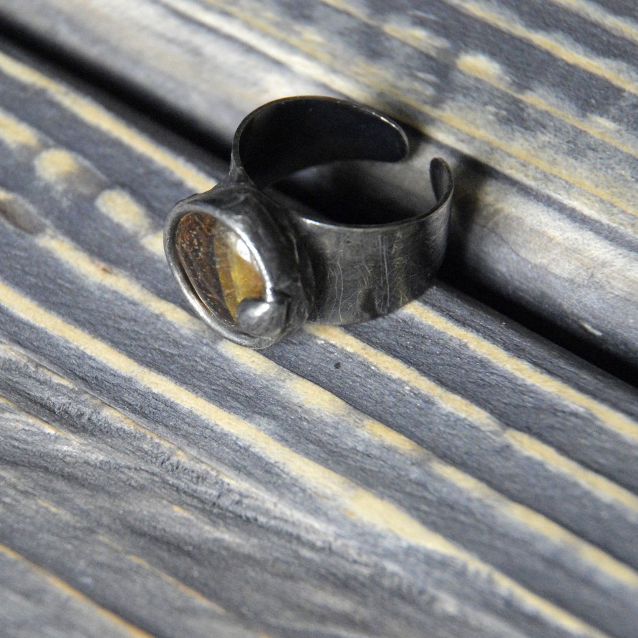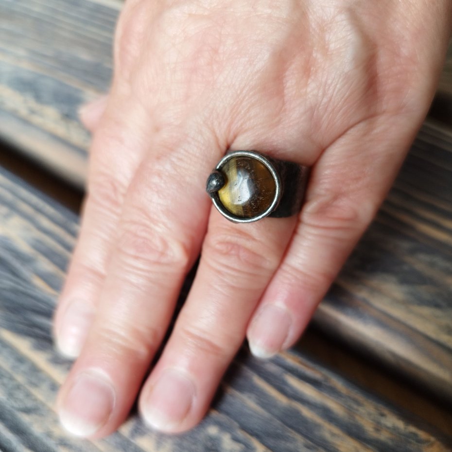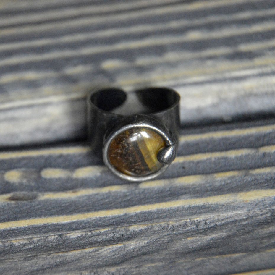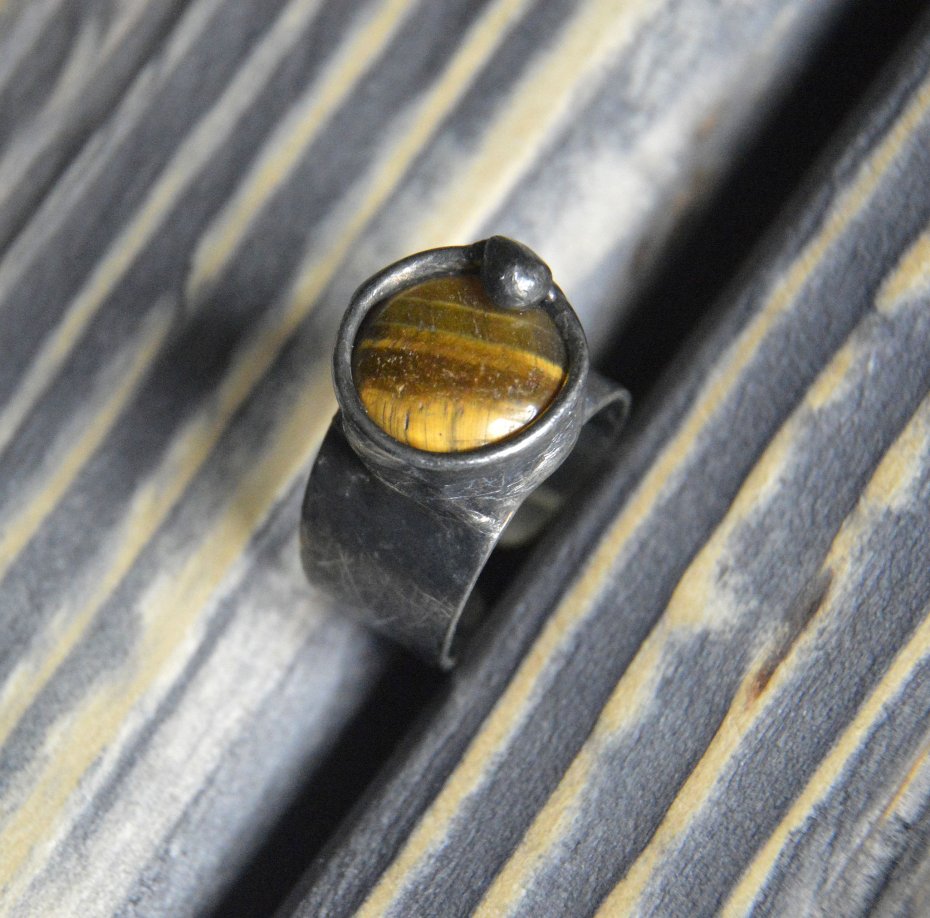 Artystyczny pierścionek wykonany ze kaboszonu Tygrysiego Oka oprawionego stopem cyny na miedzianej bazie. Średnica pierścionka to ok. 1.2 cm , całość stylizowana na stare srebro i ręcznie polerowana. Pierścionek posiada regulowaną obrączkę Zapraszam do zakupu.