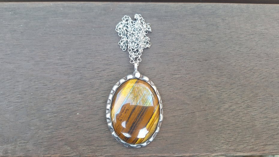 Wisiorek wykonany z miedzi, cyny i tygrysiego oka. Wymiary ok. 5 na 4 cm. Zawieszony na łańcuszku o długości ok. 50 cm.