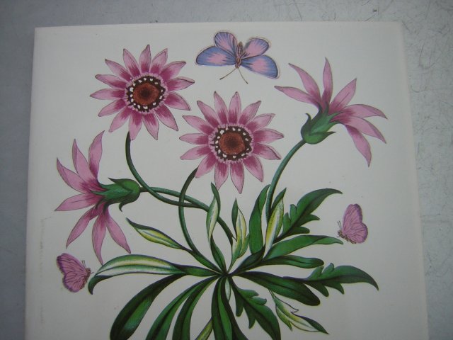 Rosa canina, Hiacinthus i gazania ringens...Fantastyczne zdobienie autorstwa SUSAN WILLIAMS ELLIS. Kafle porcelanowe, solidne, dźwięczne na satynowo szkliwione. Zdobienie kompatybilne do tych na wyrobach firmy Portmeirion. Tu sygnatura H&R JOHNSON TILES MADE IN ENGLAND. Do wklejenia, po dodaniu uchwytu do powieszenia, oprawienia. Rzadko spotykany rarytasik.