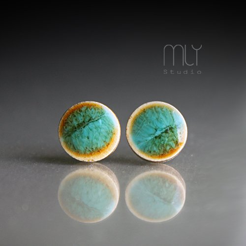 Ceramiczne okrągłe kolczyki, ręcznie wykonane z delikatnej gliny kamionkowej, jednostronnie szkliwione mieszanką zielonych i miodowo brązowych szkliw z efektem plamek, na antyalergicznych sztyftach w kolorze srebrnym. Średnica ok. 11mm. Polecam