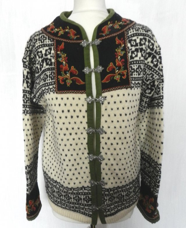 Piekny sweter zapinany na solidne metalowe sprzączki z bogatym haftem