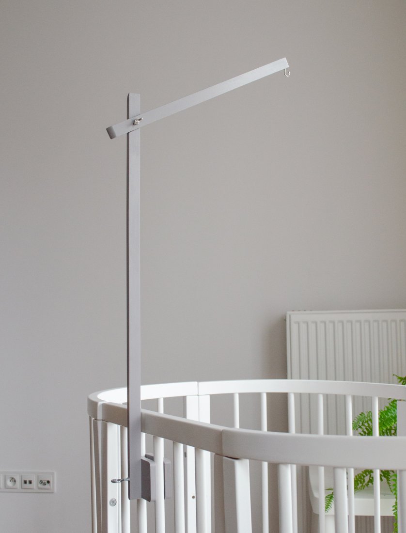 Ręcznie wykonany uchwyt z drewna sosnowego do karuzeli niemowlęcej. Stabilny montaż pod kątem 45° i wysokość 30 cm od oczu dziecka gwarantują bezpieczeństwo.