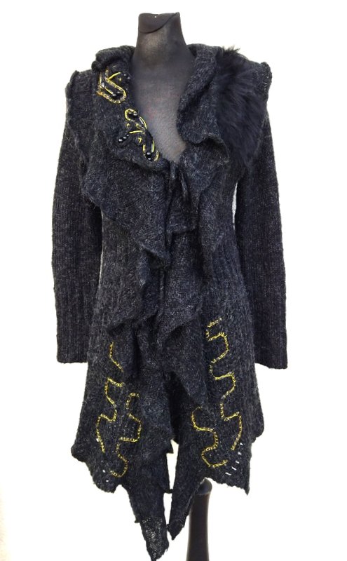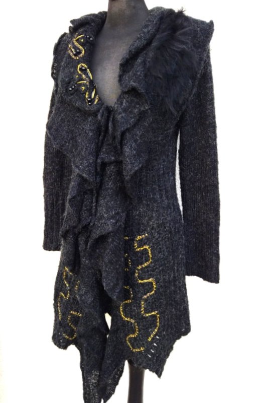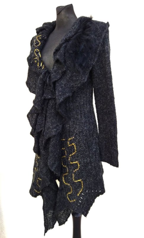 Miły, mięciutki sweter o fantazyjny kroju z licznymi zdobieniami : falbany, królicze futerko, hafty i koraliki. Taliowany , wiązany troczkami z przodu. Asymetryczny - spiczaste poły przody dłuższe od tyłu. Bardzo efektowny, ładniejszy w realu.