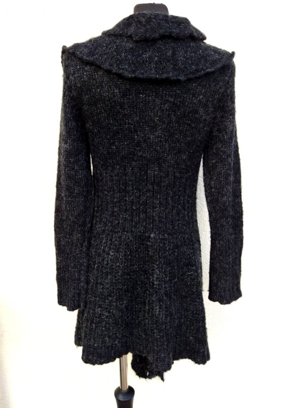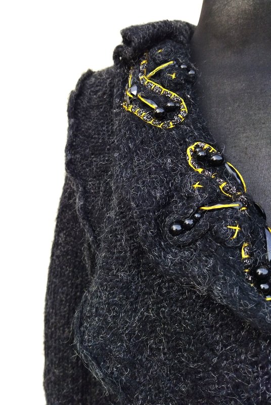 Miły, mięciutki sweter o fantazyjny kroju z licznymi zdobieniami : falbany, królicze futerko, hafty i koraliki. Taliowany , wiązany troczkami z przodu. Asymetryczny - spiczaste poły przody dłuższe od tyłu. Bardzo efektowny, ładniejszy w realu.