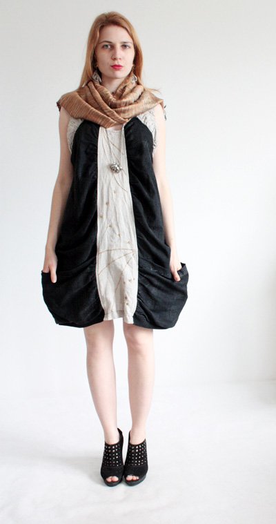 Niezwykła, oryginalna sukienka luksusowej duńskiej marki ULDAHL. Na czarnych elementach tkaniny występują nierównomierne odbarwienia (przetarcia jak na jeansach). Sukienka jest drapowana, ozdobiona ręcznymi haftami.
