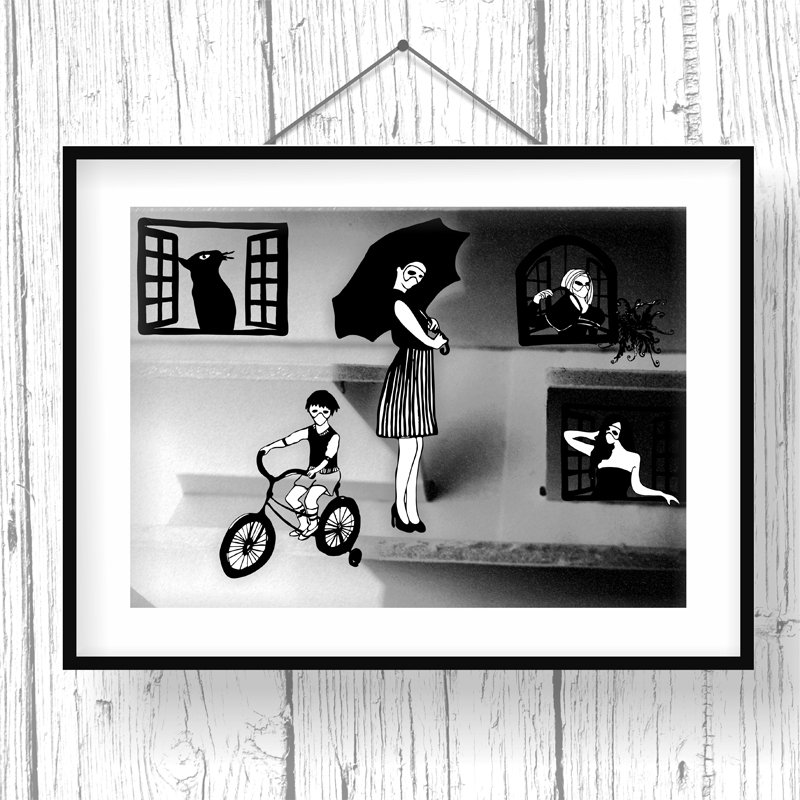 Ilustracja wykonana techniką własną w formie plakatu na ścianę. Wydruk atramentowy na papierze fotograficznym w formacie a4 (297x210 mm.). Możliwe jest zamówienie tej ilustracji również w formacie 30x40 cm. Ilustracja jest bez oprawy.