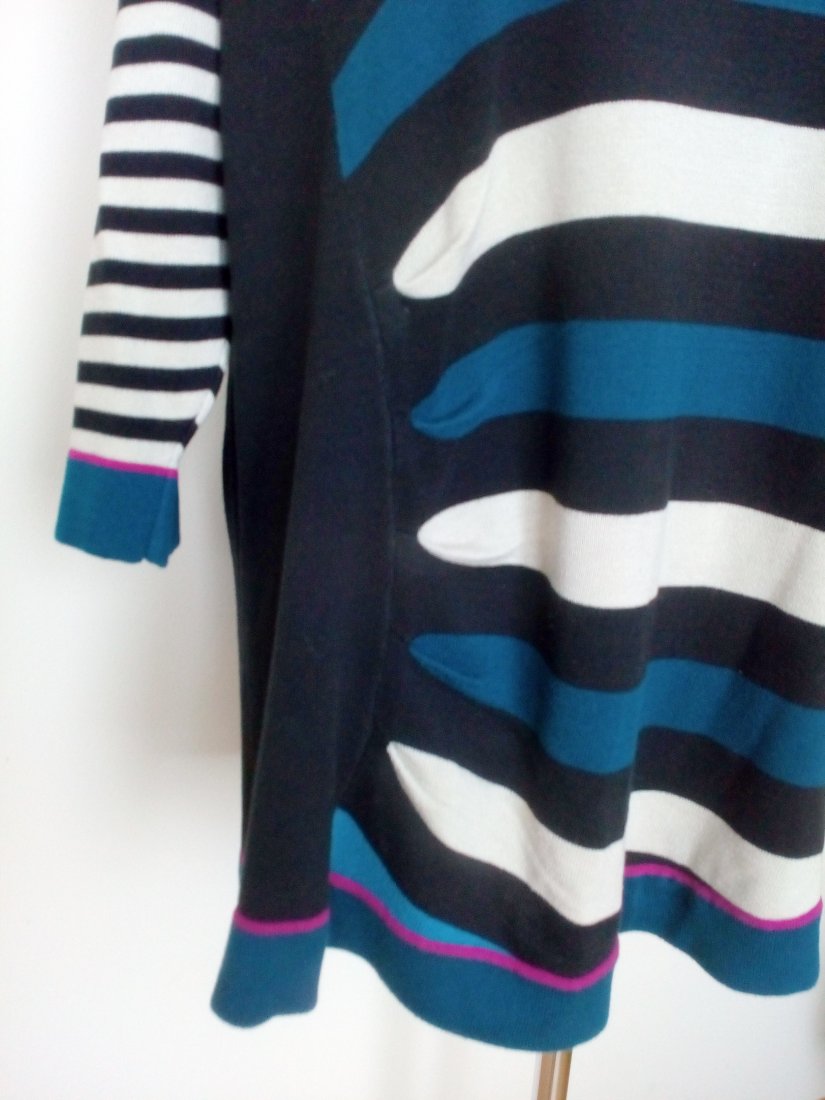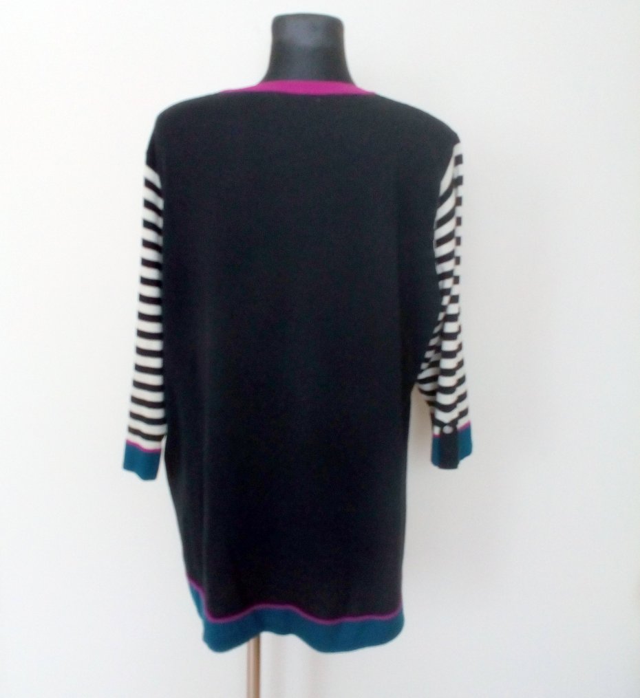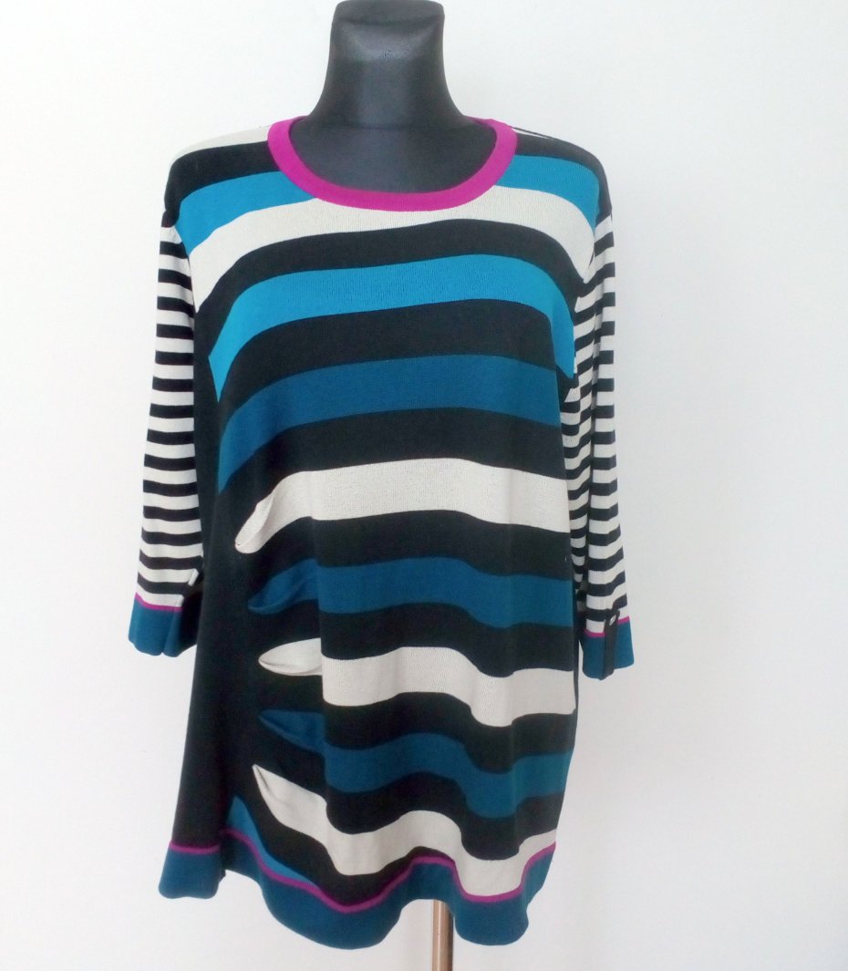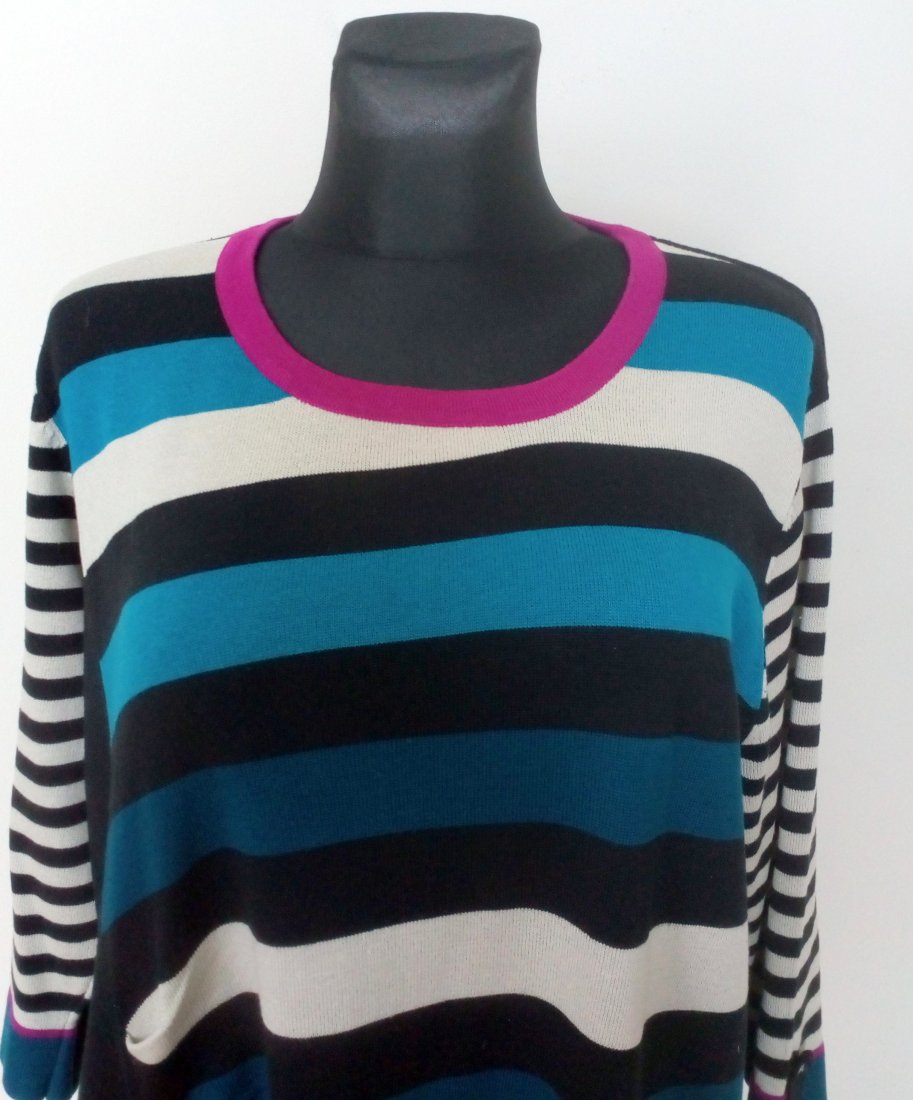 Kolorowy sweter z drapowaniem/ zakładkami na prawym boku, dekolt okrągły, rękaw 3/4, kolorystyka: czarny, beż, ciemna zieleń, fuksja