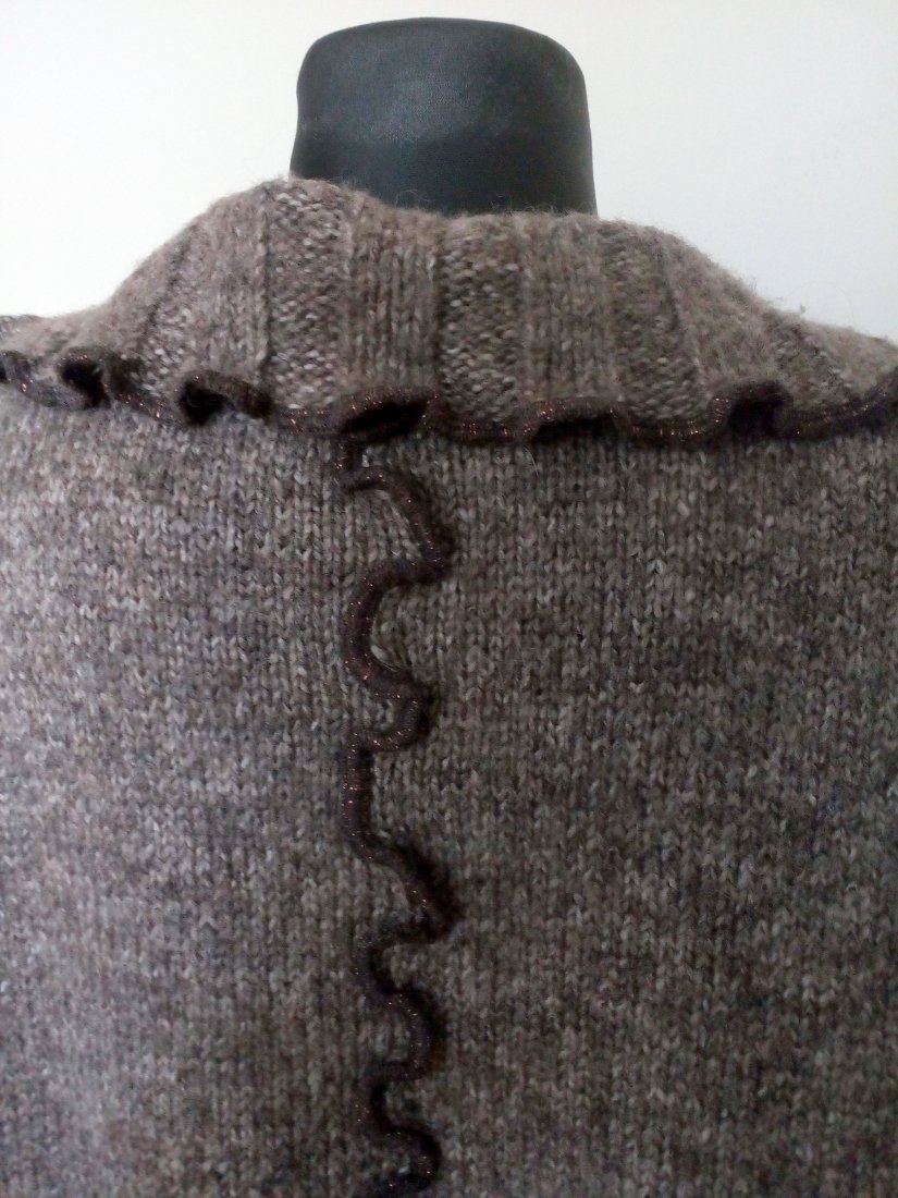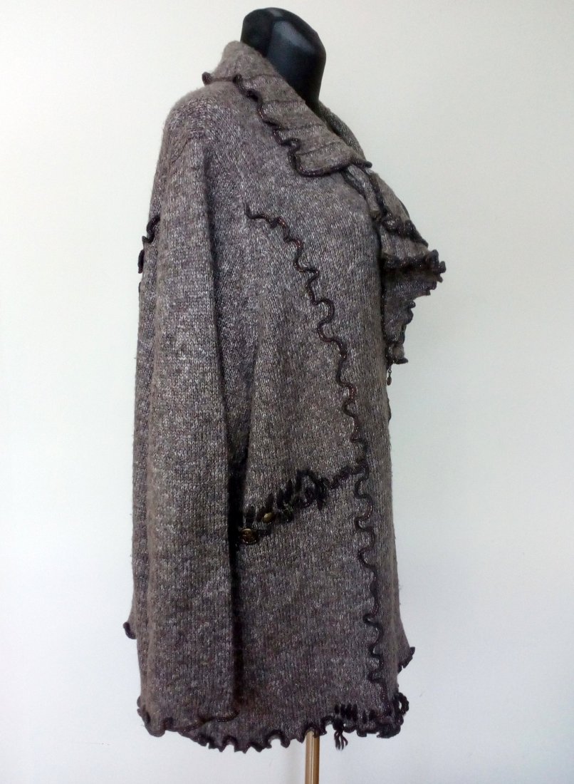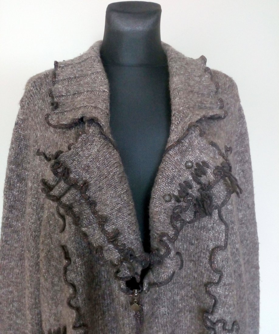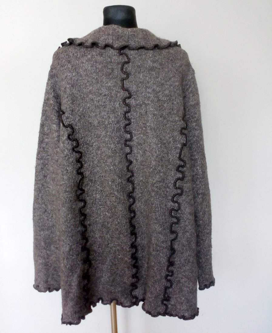 Artystyczny sweter w melanżowym, brązowym kolorze, zapinany na przodzie na krótki zamek, całość bez podszewki
