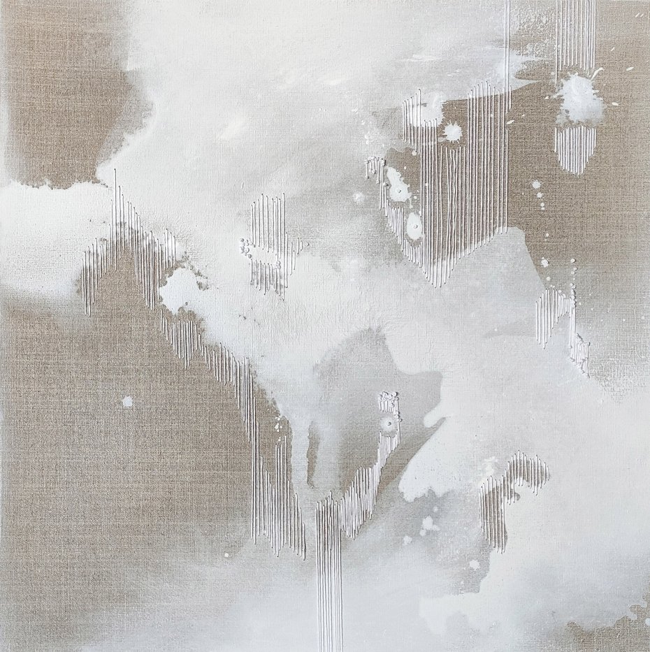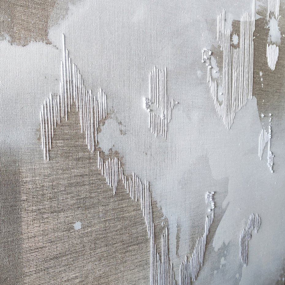 Nowoczesny abstrakcyjny i niezwykle delikatny obraz wykonany technice haftu połączonej z malarstwem, na surowym płótnie lnianym zatytułowany "Ulotnie I".