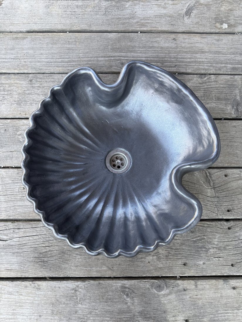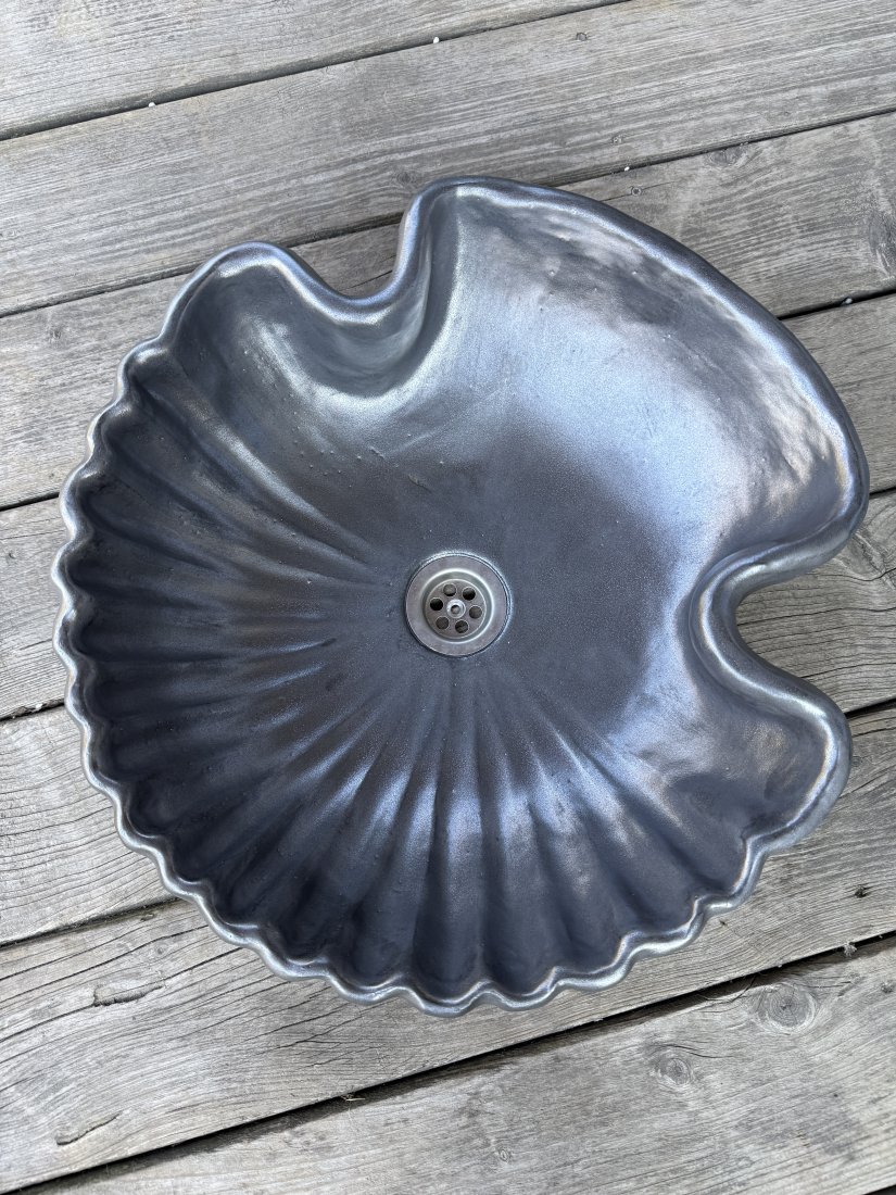 Bardzo nietypowa umywalka ceramiczna, nablatowa, wykonana ręcznie, w kształcie muszli, w odcieniu grafitowym.
