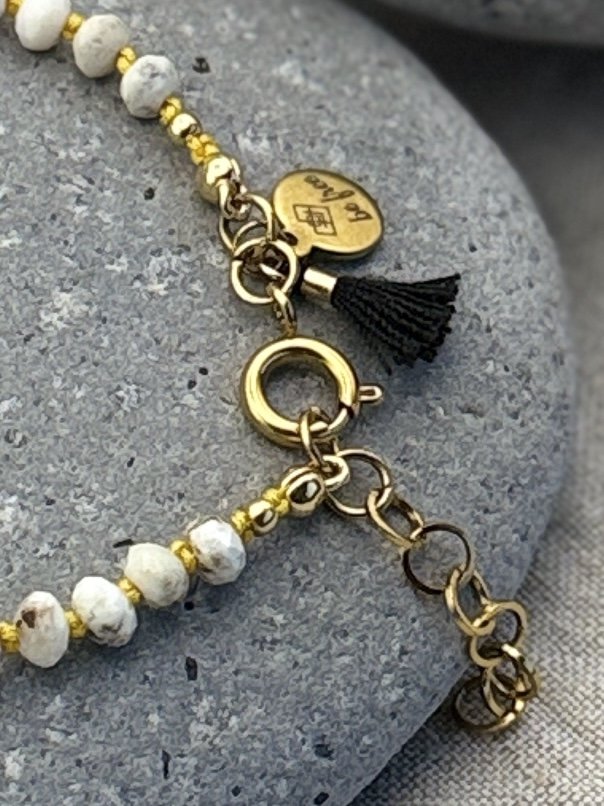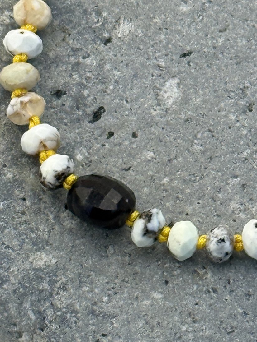 Każdy kamień został oddzielony precyzyjnym supełkiem na wytrzymałym, żółtym sznureczku nylonowym, co zapewnia elastyczność i trwałość.