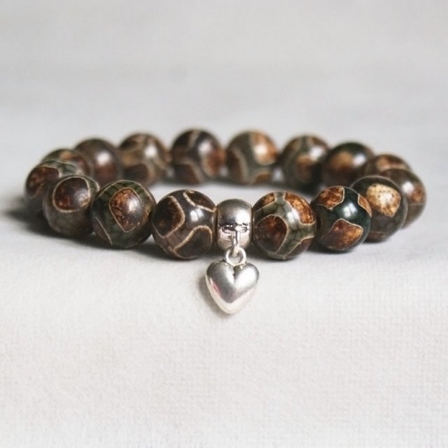 śliczna, niezwykle efektowna i okazała bransoletka na podwójnej lince elastycznej, wykonana z pięknego, unikalnego agatu tybetańskiego. (półmatowe kule 12mm) oraz metalowych elementów.... Kamienie te przybyły z daleka specjalnie dla Ciebie;-) Są prawie niedostępne w Polsce, mi udało się je sprowadzić bezpośrednio od hurtownika, stąd przystępna cena bransoletki...... AGAT TYBETAŃSKI - znaleźć go można w Tybecie i Nepalu, ma ponoć niezwykłe, ochronne właściwości – chroni przed nieszczęściem i chorobami, jest źródłem pozytywnej energii. Ma służyć jako talizman. BRANSOLETKA PASUJE NA STANDARDOWY NADGARSTEK 15-16,5cm..