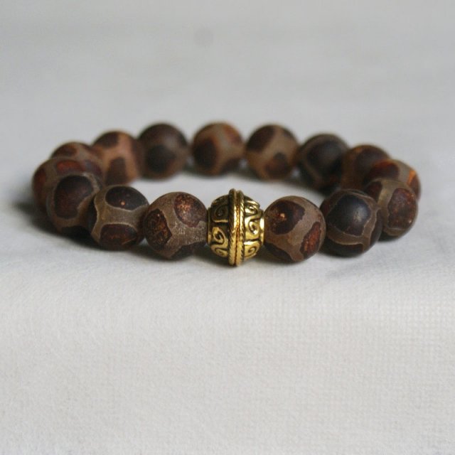 śliczna, niezwykle efektowna i okazała bransoletka na podwójnej lince elastycznej, wykonana z pięknego, unikalnego agatu tybetańskiego. (matowe kule 12mm) oraz masywnej, ozdobnej metalowej przekładki... Kamienie te przybyły z daleka specjalnie dla Ciebie;-) Są prawie niedostępne w Polsce, mi udało się je sprowadzić bezpośrednio od hurtownika, stąd przystępna cena bransoletki...... AGAT TYBETAŃSKI - znaleźć go można w Tybecie i Nepalu, ma ponoć niezwykłe, ochronne właściwości – chroni przed nieszczęściem i chorobami, jest źródłem pozytywnej energii. Ma służyć jako talizman. BRANSOLETKA PASUJE NA NADGARSTEK 14-15,5 cm......BIŻUTERIA ZAWSZE PODRÓŻUJE W OZDOBNYM OPAKOWANIU :-).