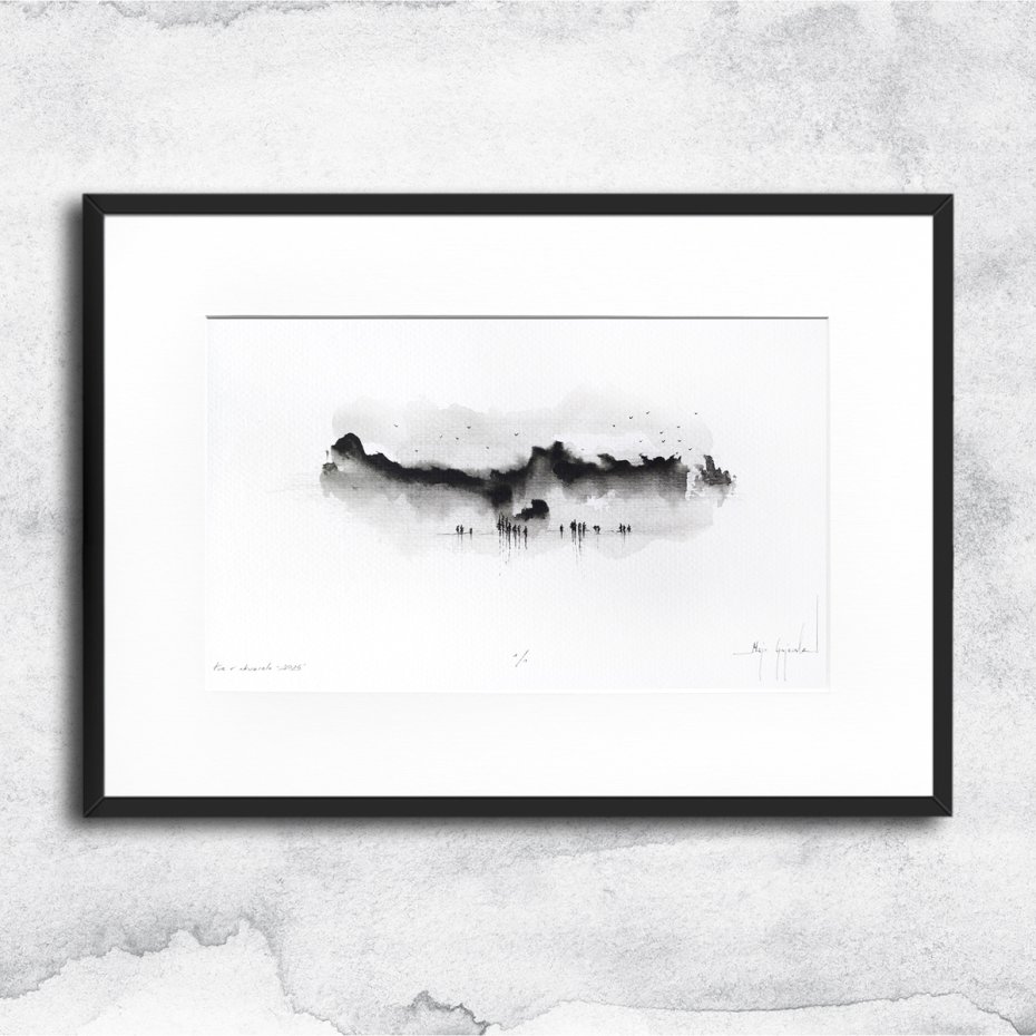 Każda z prac wykonana jest w pojedynczym egzemplarzu. Autorski rysunek wykonany w technice tusz i akwarela na białym, lekko fakturowanym, tradycyjnym papierze graficznym. Praca oprawiona jest w białe passe partout i czarną, aluminiową ramę.