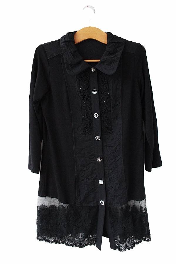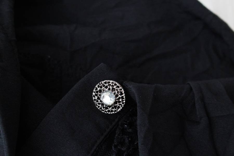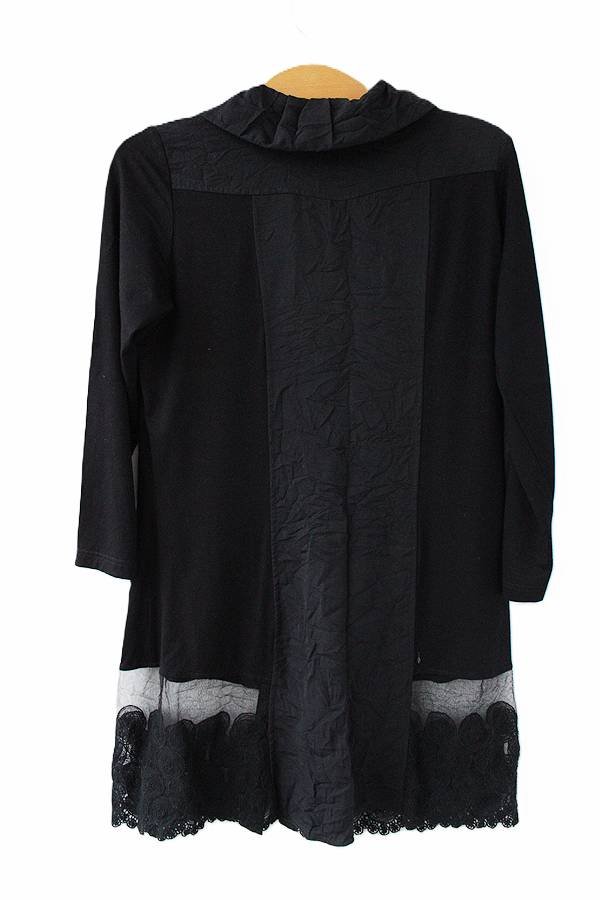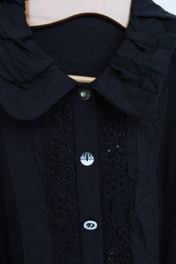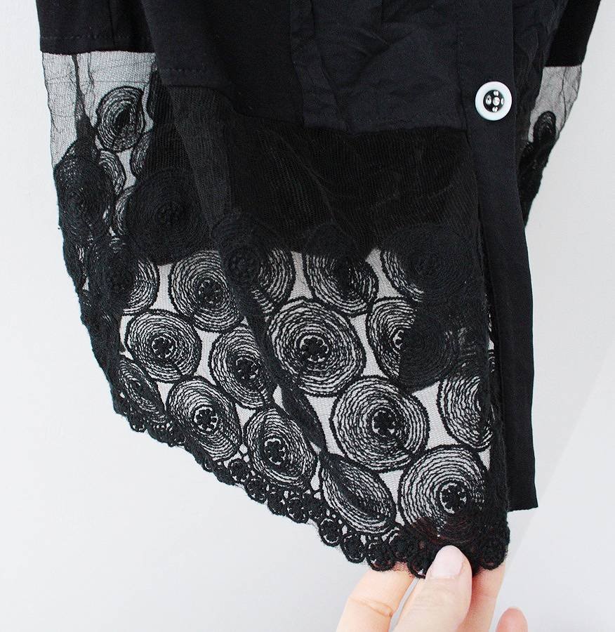 Unikatowa czarna tunika/bluzka/mini sukienka pełna nietuzinkowych detali. Ciekawie łączą się tu materiały o różnych fakturach - półprzezroczyste, gniecione, zdobione. Boki i rękawy są wykonane z elastycznej bawełny.