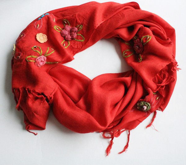 Niesamowity szal ozdobiony aplikacjami na węższych brzegach. Materiał to prawdopodobnie wiskoza.