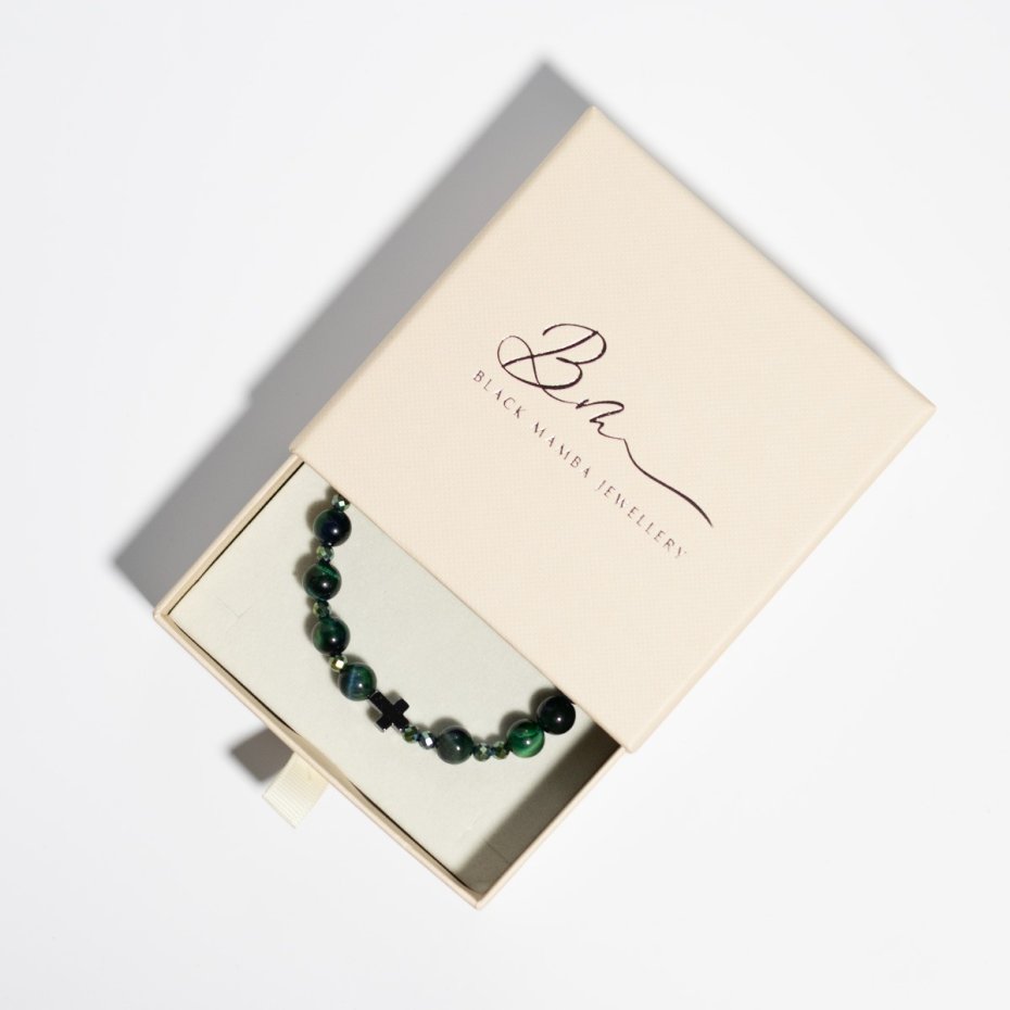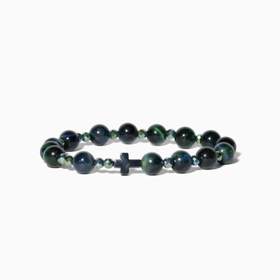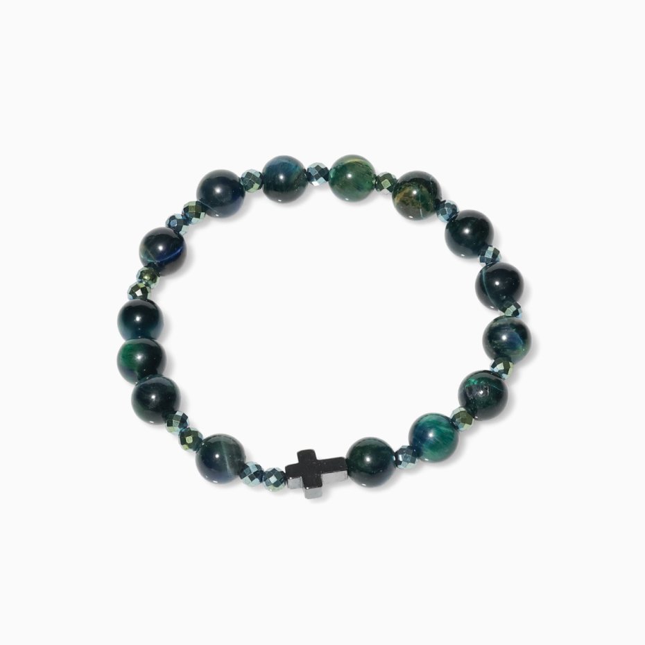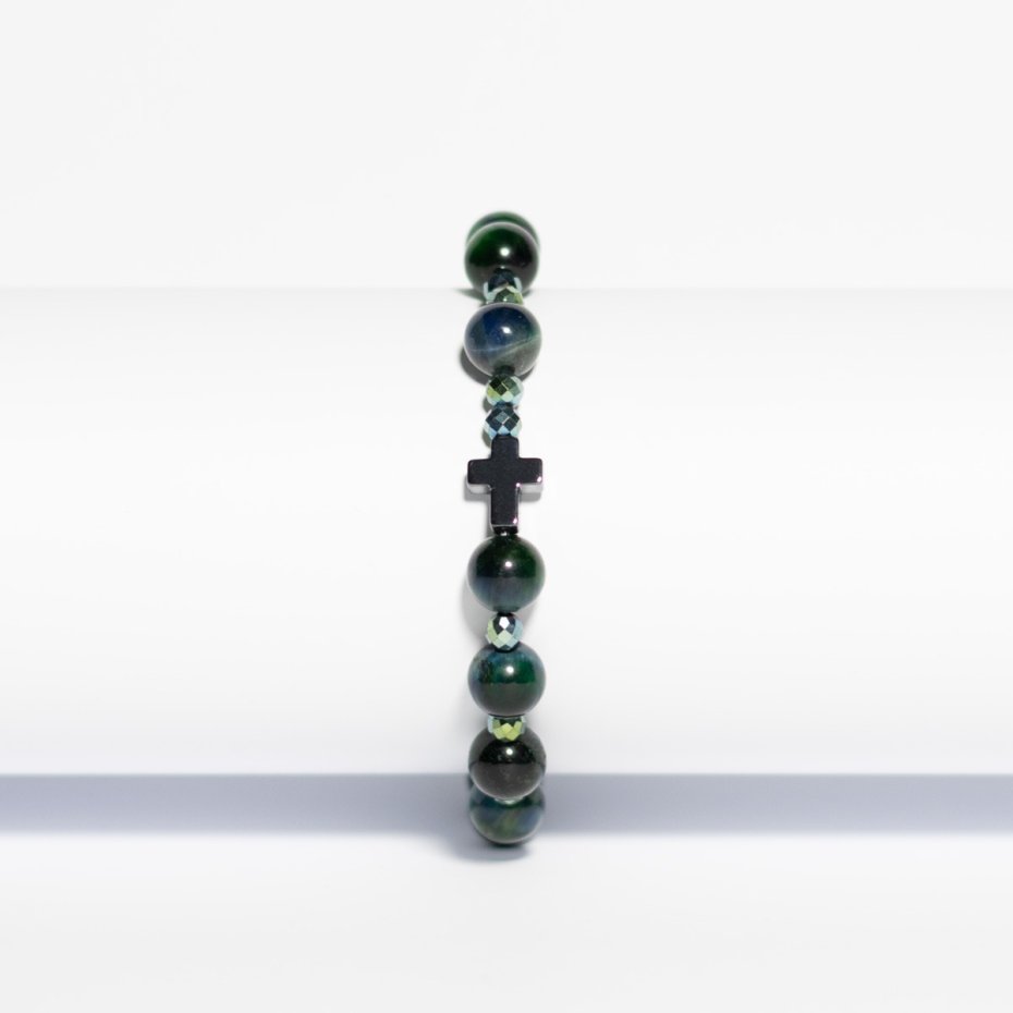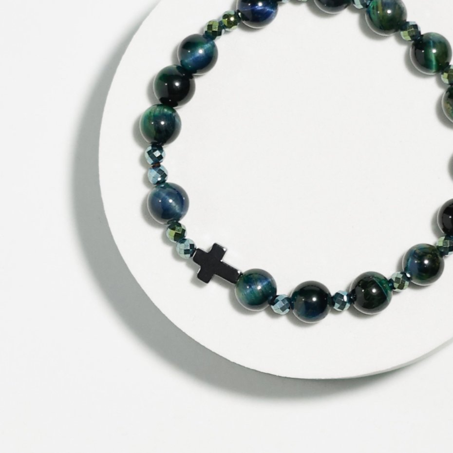 W centrum bransoletki znajduje się krzyżyk z hematytu – symbol ochrony, wiary i duchowej równowagi. Ten drobny detal nadaje jej wyjątkowy, religijny charakter, czyniąc ją doskonałym dodatkiem dla osób pragnących mieć przy sobie znak swojej duchowości każdego dnia. Bransoletka może służyć zarówno jako różaniec do modlitwy, jak i amulet przynoszący wewnętrzny spokój i poczucie bezpieczeństwa.