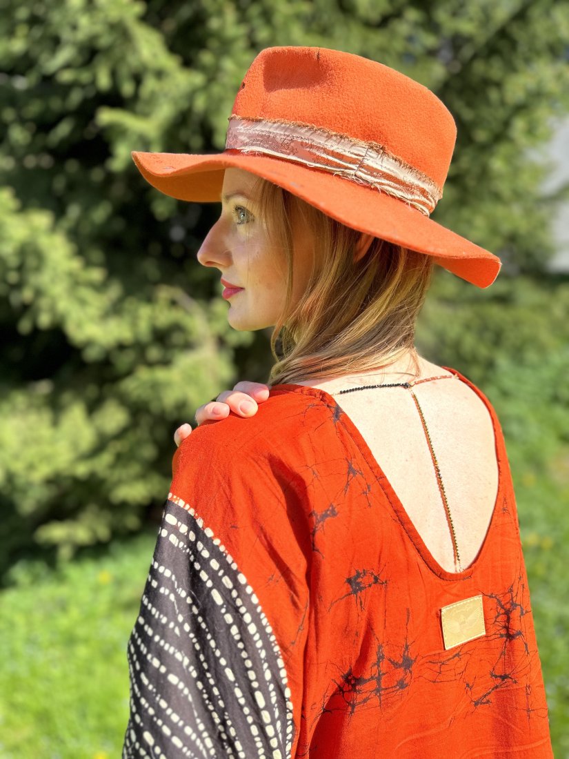 "Kraken - Głębia i Ogień" jest opowieścią o sile i intensywności. Jej ceglasto-pomarańczowa tkanina pulsuje energią ognia, pasją, życiem. Czarnomorskie fale, malowane na materiale, wprowadzają głębię, tajemnicę i rytm oceanu — siłę, która kryje w sobie moc transformacji.