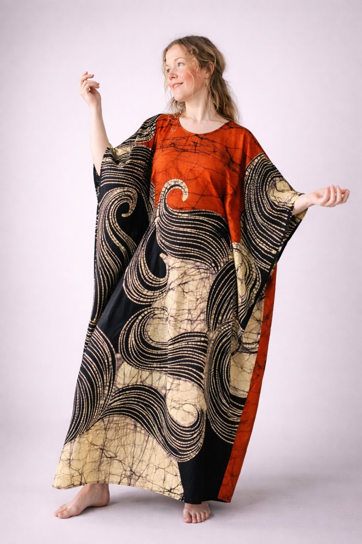 Bawełniana suknia maxi z kolekcji Malowane Słońcem powstała z ręcznie malowanej tkaniny batikowej tworzonej przez artystów na Sri Lance. Każdy wzór jest jak obraz – niepowtarzalny, organiczny, pulsujący kolorem i rytmem natury.