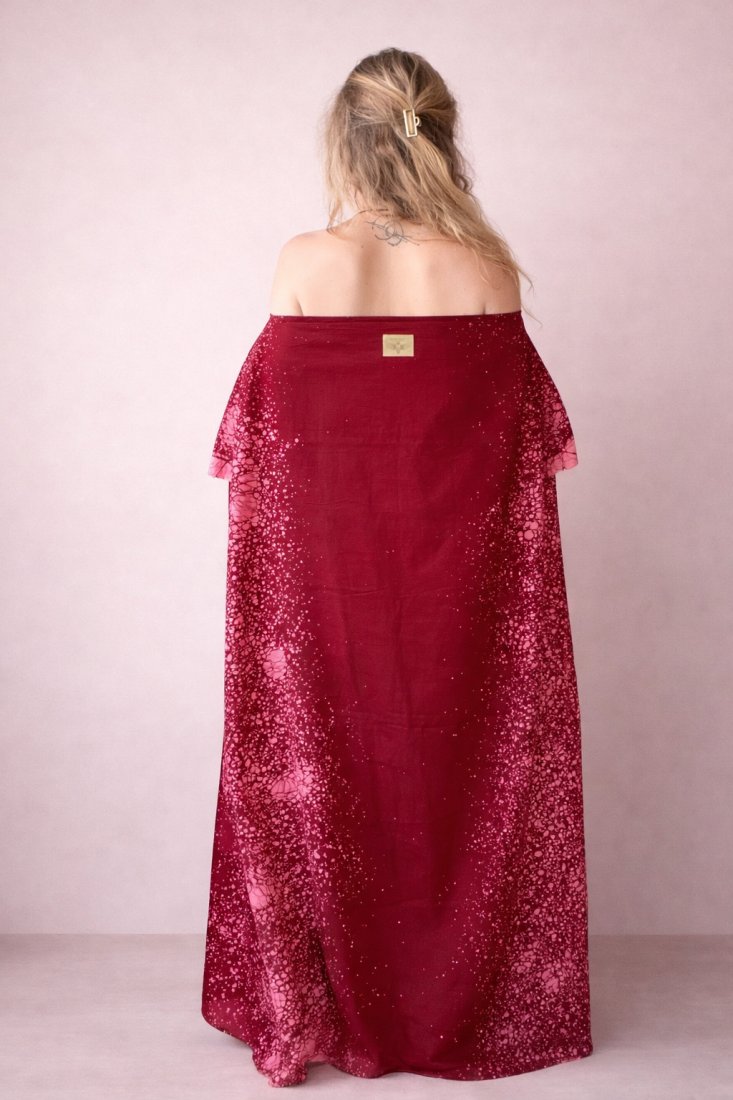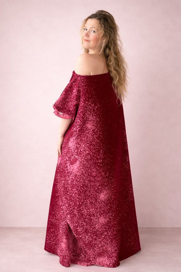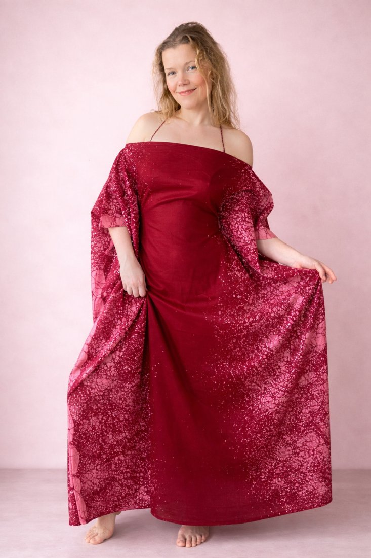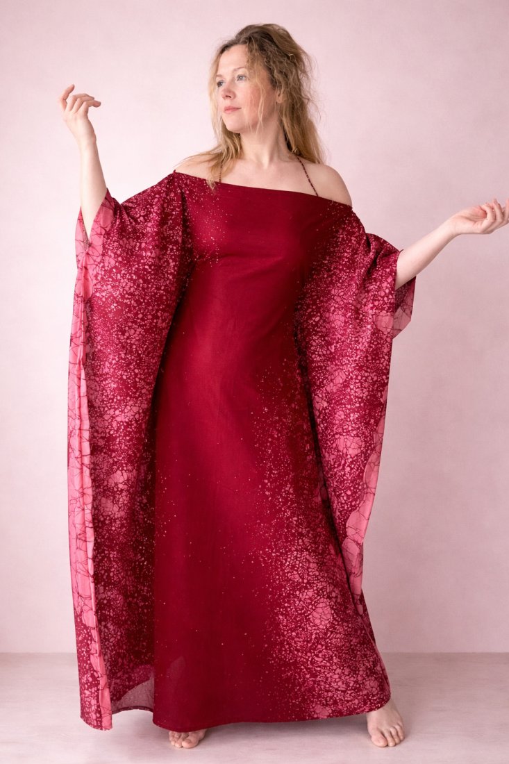 Bawełna oddycha razem z Tobą. Ruch tkaniny otula, nie ogranicza. Ręcznie malowany batik pulsuje jak serce: naturalnie, nieregularnie, prawdziwie.