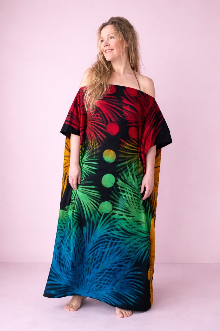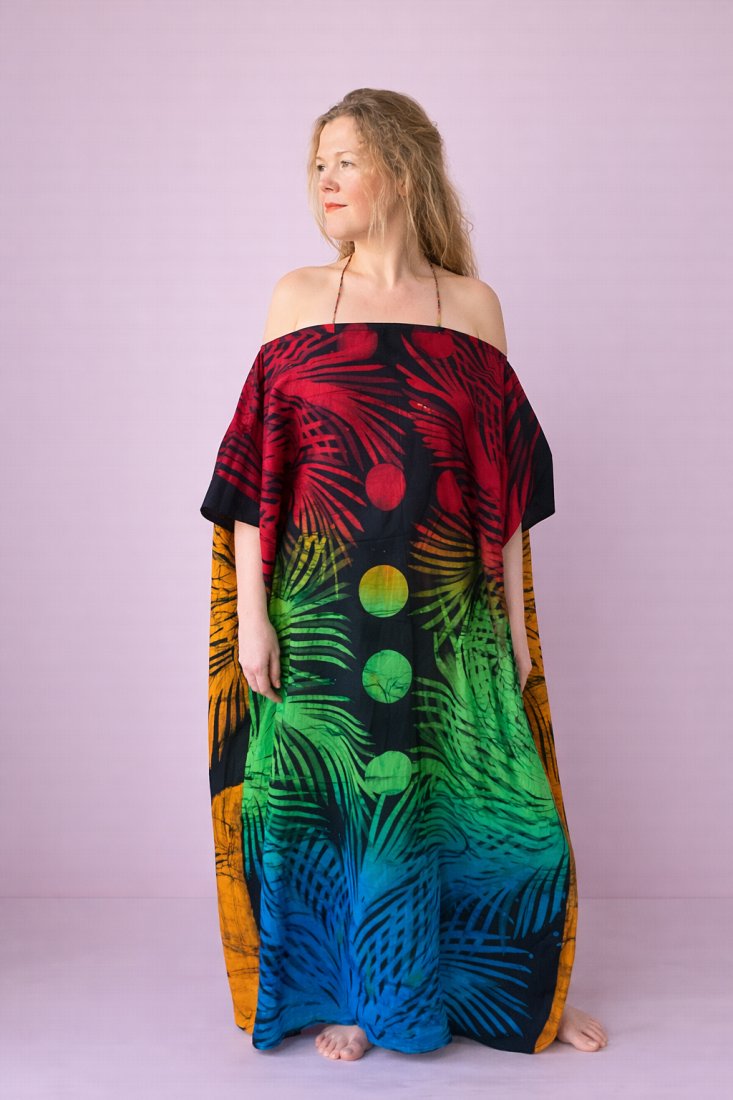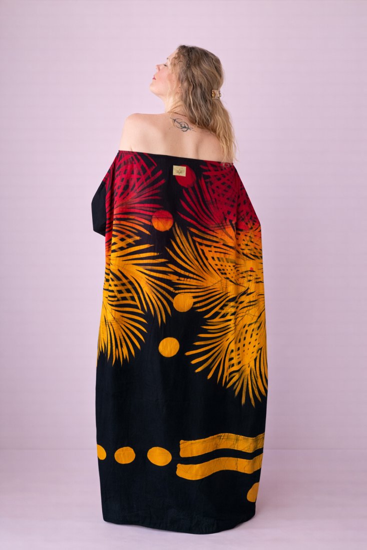 Materiał: 100% bawełna barwiona ręcznie techniką batiku. Tkanina cieniutka, lekka, przewiewna, oddychająca – delikatnie otula ciało i swobodnie pracuje w ruchu.