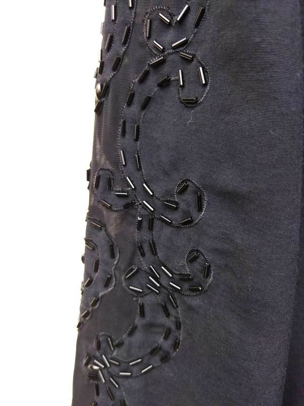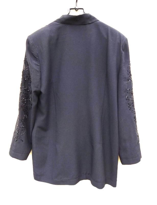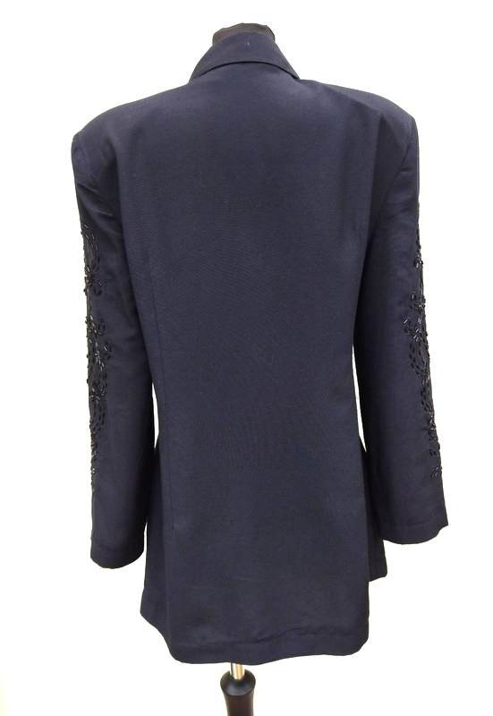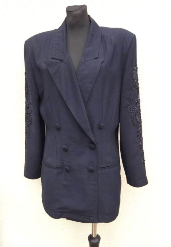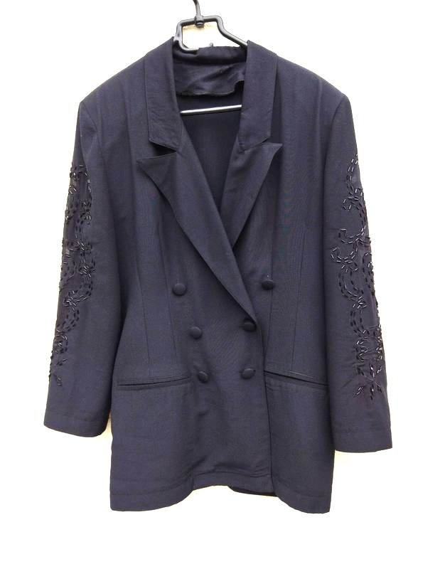 Elegancka marynarka vintage z wiskozowo-poliestrowej tkaniny w czarnym kolorze z transparentnymi wstawkami na rękawach zdobionymi podłużnymi czarnymi koralikami ( makaronikami). Taliowna , z kołnierzem z rewersami, z dwiema wpuszczanymi kieszeniami. W ramionach poduszki - łatwe do odprucia. Dwurzędowa zapinana na obciągane tkaniną guziki. Bez podszewki.