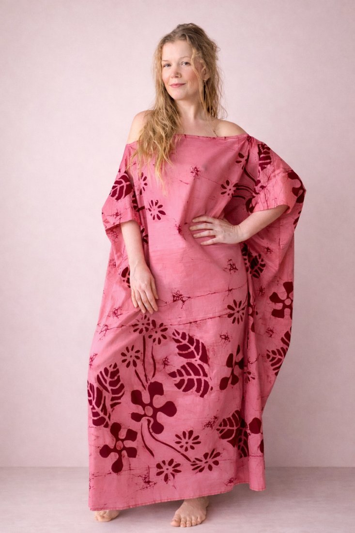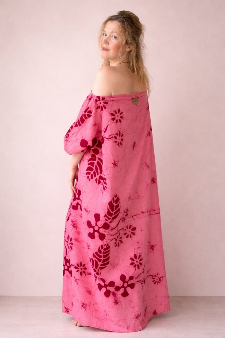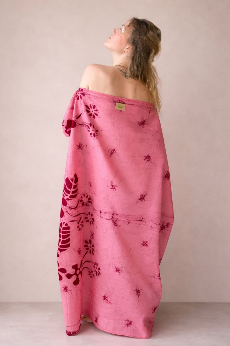 Bawełna oddycha razem z Tobą. Ruch tkaniny otula, nie ogranicza. Ręcznie malowany batik pulsuje jak serce: naturalnie, nieregularnie, prawdziwie.