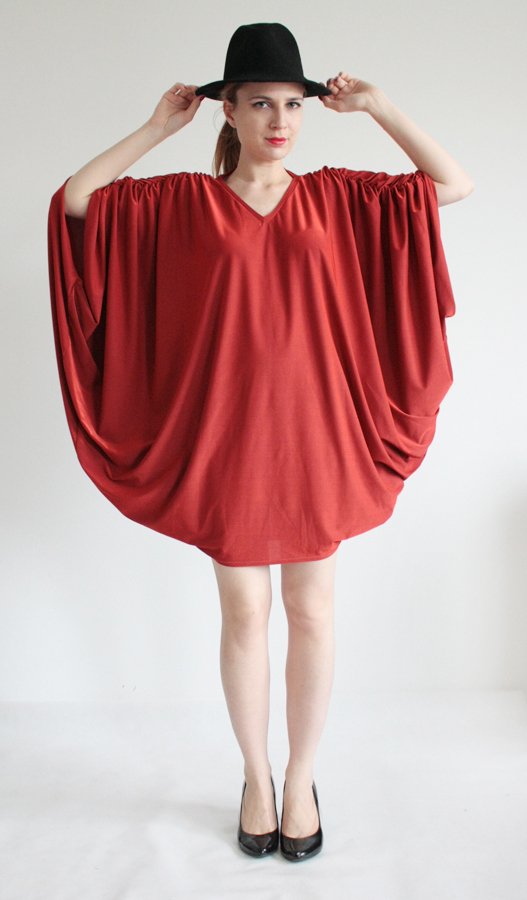 Sukienka o fantazyjnym, oversizowym fasonie skandynawskiej marki IDA KAT. Materiał to prawdopodobnie wiskoza z domieszką poliestru i lycry. Na ramionach wszyte gumki.