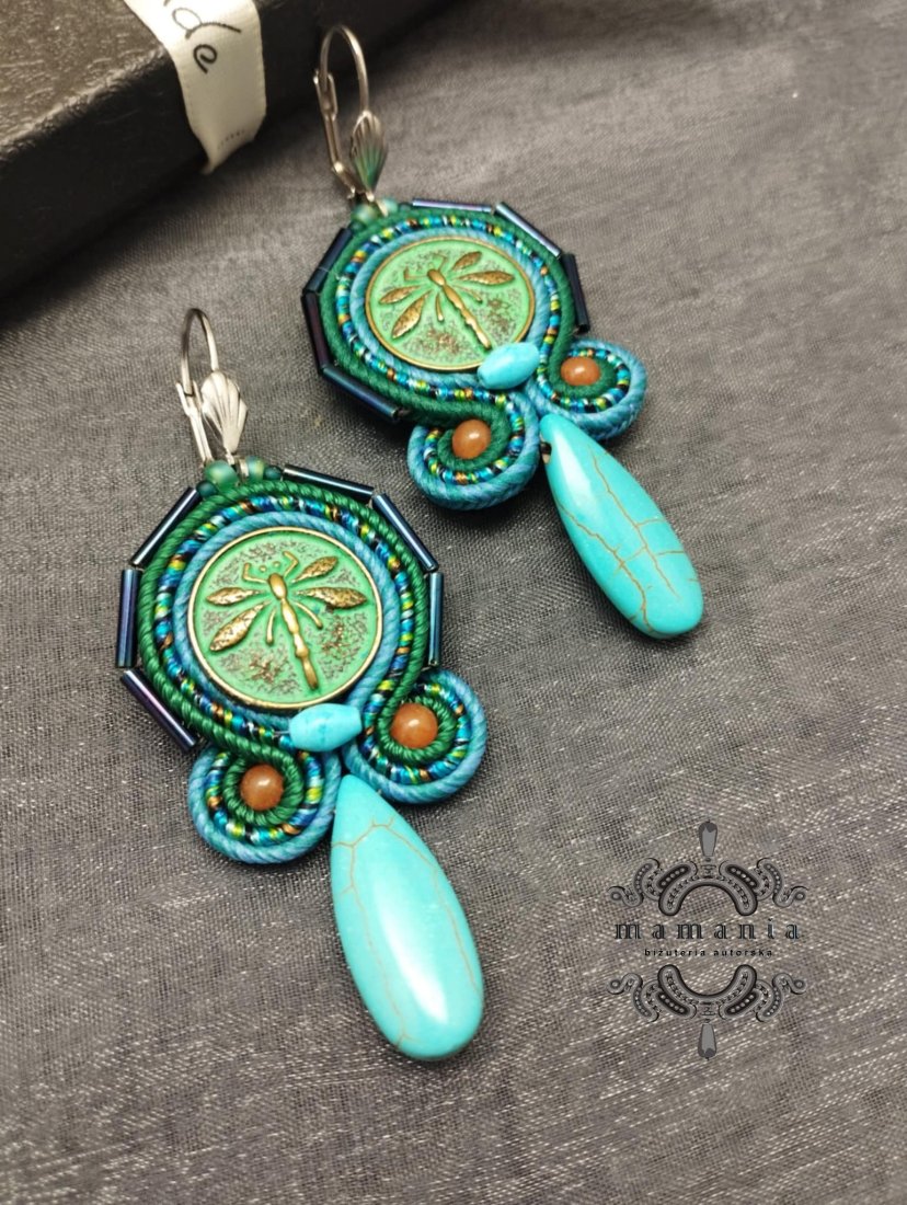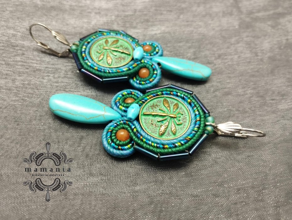 Wykorzystane materiały to: sutasz grecki, metalowe guziki z ważką, krople howlitu, kuleczki jadeitu koraliki Toho