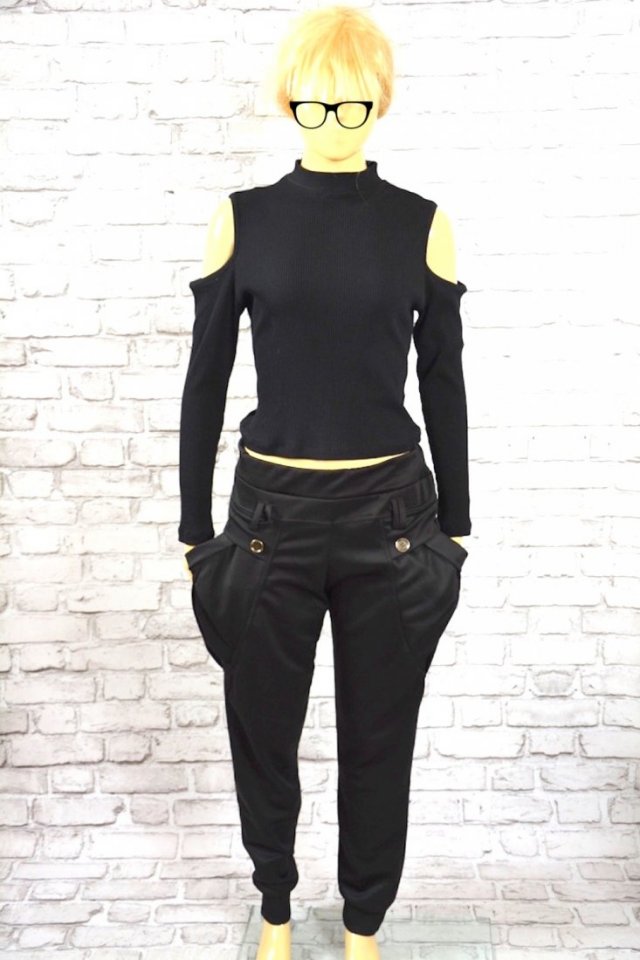 Unikatowe czarne spodnie o fajnym kroju dzięki luźno odstającym po bokach kieszeniami,