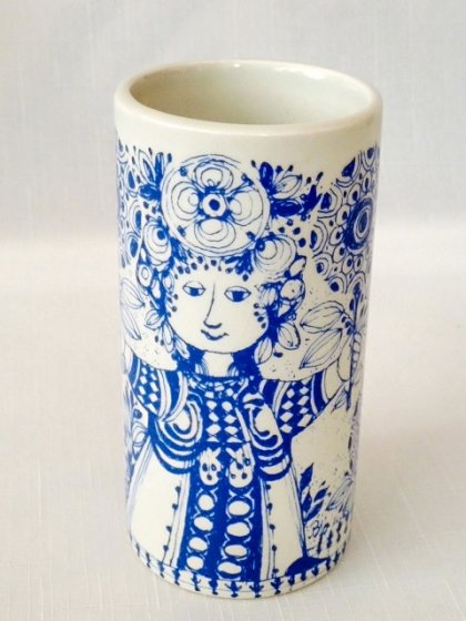 Mały wazonik dekoracyjny znakomitej i rzadko spotykanej manufaktury duńskiej Nymolle. Wazonik z serii Flora. Malowany przez artystę Bjorna Wiinblada, który zmarł w 2006 roku. Artysta współpracował z tą manufakturą od 1946 roku. Ten nadzwyczaj utalentowany artysta zaskakiwał niepowtarzalnością i róznorodnością swych dzieł, które dziś są wielce cenione na całym świecie oraz uważane za unikatowe. Malatura w kolorze niebieskim. Przedstawia baśniową postać kobiety w otoczeniu kwiatów. Sygnowany pod spodem numerem 3157-1315. Wazoniki takie na aukcjach internetowych wyceniane są w granicach 40-50 dolarów. Stan zachowania bardzo dobry.