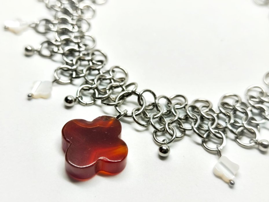 Centralna zawieszka: agat czerwony (odcienie brązu, czerwieni i karmelu; kolorystycznie przypomina bursztyn).