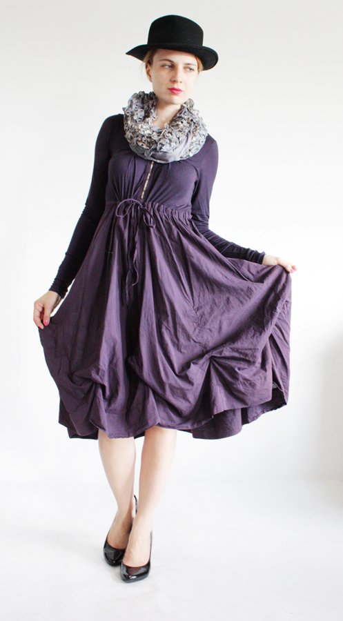 Włoska drapowana sukienka o niezwykłym fasonie. Górna część z rozciągającej się tkaniny. Obwód w talii regulowany wiązanym troczkiem.
